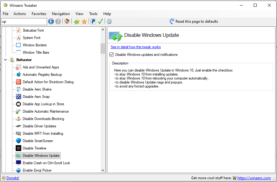 2. С помощью программы Winaero Tweaker. В ней слева в дереве выбираем "Behavior" - "Disable Windows Updates and notifications" и ставим галку. Служба глохнет пока галку не снимете. Настройка не слетает. Каталог с программой можно спокойно скопировать на флешку/сеть и запускать оттуда.